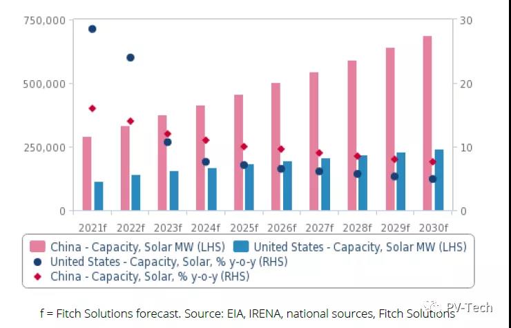 Fitch報告預測稱,中國的太陽能裝機容量將從2020年年底的253.4GW增至2030年的690.3GW。在提交給聯(lián)合國的最新國家自主貢獻報告中,中國的目標是2030年實現(xiàn)1.2TW可再生能源容量。