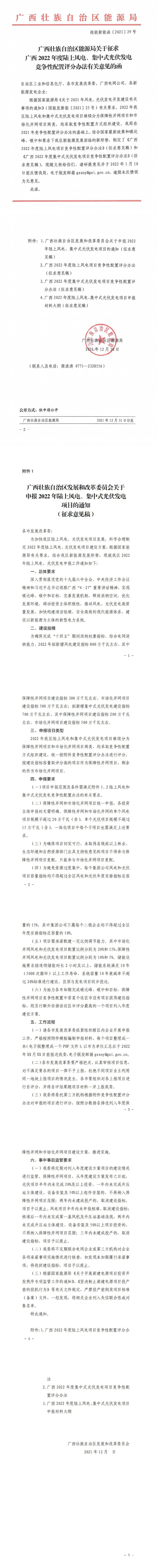 12月31日,廣西壯族自治區(qū)能源局發(fā)布了關(guān)于征求廣西2022年度陸上風(fēng)電、集中式光伏發(fā)電競爭性配置評分辦法有關(guān)意見的函。廣西2022年擬新增風(fēng)電建設(shè)指標(biāo)800萬千瓦左右,其中,保障性并網(wǎng)項目300萬千瓦左右,市場化并網(wǎng)項目500萬千瓦左右;擬新增集中式光伏發(fā)電700萬千瓦左右,其中保障性并網(wǎng)項目200萬千瓦左右,市場化并網(wǎng)項目500萬千瓦左右。