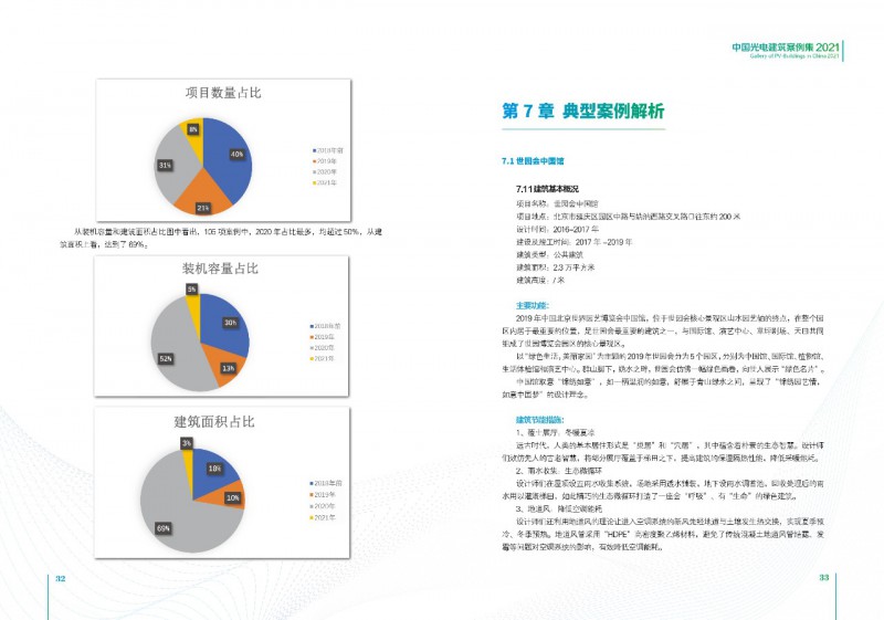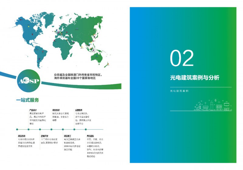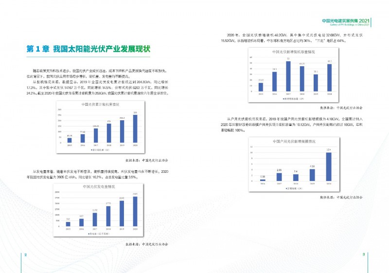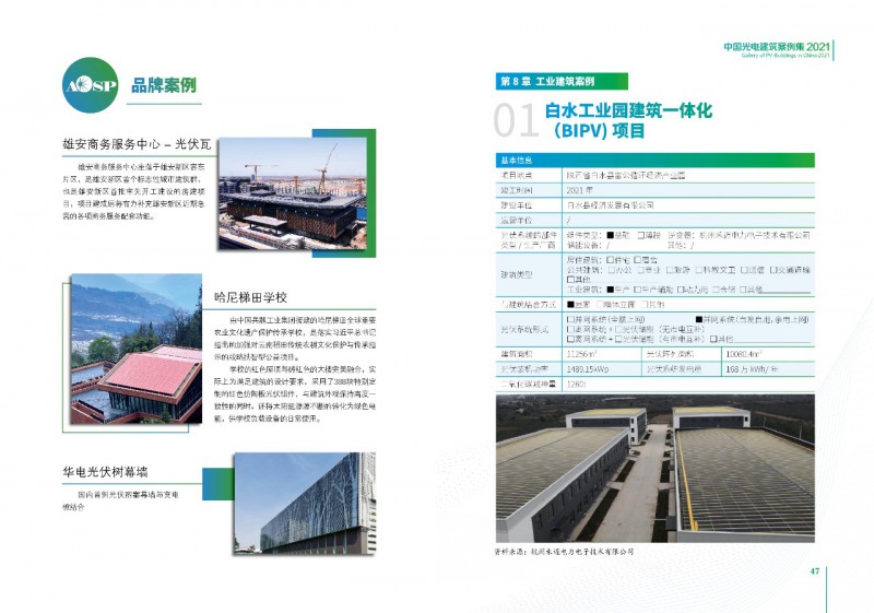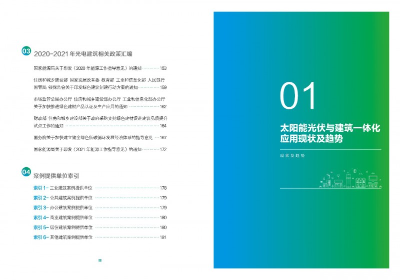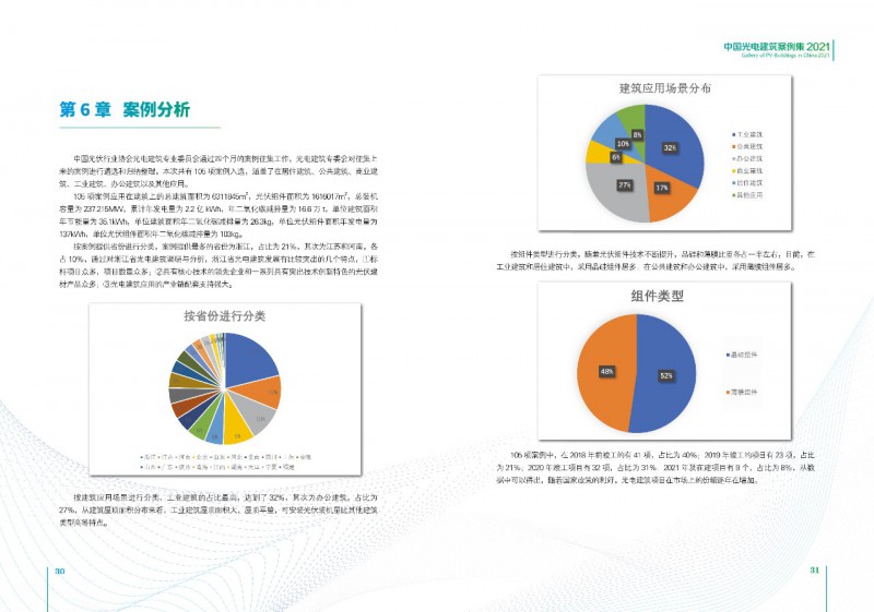 《案例集》分析和總結(jié)我國光電建筑應(yīng)用現(xiàn)狀、國內(nèi)外發(fā)展趨勢、技術(shù)要點(diǎn)等內(nèi)容,為行業(yè)發(fā)展提供基礎(chǔ)數(shù)據(jù)。經(jīng)過案例篩選,共收錄了105項(xiàng)光電建筑典型案例,涵蓋了我國工業(yè)建筑、公共建筑、辦公建筑、商業(yè)建筑、居住建筑及其他建筑類型光伏應(yīng)用,為光伏在建筑上大規(guī)模應(yīng)用提供了依據(jù)和參考價(jià)值。