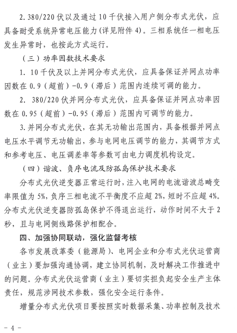 近日,國家能源局山東監(jiān)管辦公室 山東省能源局發(fā)布關(guān)于切實(shí)做好分布式光伏并網(wǎng)運(yùn)行工作的通知,通知指出四點(diǎn),一、加強(qiáng)接入能力評估,做好分布式光伏接網(wǎng)工作;二、強(qiáng)化安全運(yùn)行條件,實(shí)現(xiàn)分布式光伏精準(zhǔn)監(jiān)控調(diào)度;三、規(guī)范涉網(wǎng)技術(shù)參數(shù),保證分布式光伏并網(wǎng)性能;四、加強(qiáng)協(xié)同聯(lián)動(dòng),強(qiáng)化監(jiān)督考核。