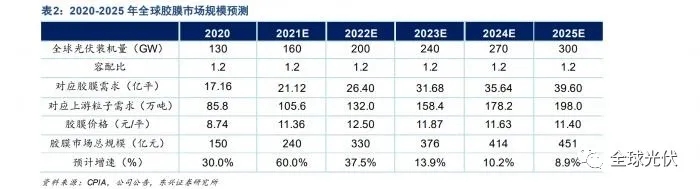 預(yù)計(jì),2021-2023年全球光伏膠膜需求約為21.1、26.4和31.7億平方米,同比增長(zhǎng)23%、25%和20%。到2025年,全球膠膜市場(chǎng)或達(dá)452億元規(guī)模,復(fù)合增速為17%。