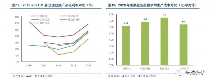 東興證券認(rèn)為,上游粒子廠商陸續(xù)投產(chǎn),光伏級(jí)粒子供給瓶頸將得到緩解,2021年原料成本端大幅上漲的壓力大概率不會(huì)延續(xù)到2022年,光伏膠膜成本有望得到進(jìn)一步控制和降低。與此同時(shí),受益光伏裝機(jī)需求增長(zhǎng),預(yù)計(jì)膠膜售價(jià)有望持續(xù)堅(jiān)挺。對(duì)于相關(guān)標(biāo)的來(lái)說(shuō),相較2021年,今年膠膜生產(chǎn)企業(yè)將會(huì)展現(xiàn)成本優(yōu)勢(shì),毛利率有望大幅上漲。綜合來(lái)看,膠膜行業(yè)議價(jià)能力和盈利能力都將有提升和改善。