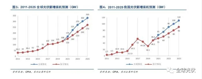 目前,全球已有130多個(gè)國(guó)家和地區(qū)相繼宣布碳中和目標(biāo),在全球提升可再生能源消費(fèi)比重的大背景下,全球新增風(fēng)光裝機(jī)將持續(xù)快速增長(zhǎng)。根據(jù)光伏年度大會(huì)理事長(zhǎng)王勃華預(yù)期,預(yù)計(jì)2021年全球光伏新增裝機(jī)量為150-170GW,并在未來(lái)幾年繼續(xù)保持年均30-40GW的增長(zhǎng),預(yù)計(jì)2025年新增全球裝機(jī)量將達(dá)270-330GW,新增裝機(jī)復(fù)合增速約17%。