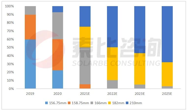 尺寸方面,2021年166mm硅片與大尺寸硅片(182和210)為市場(chǎng)主流,2022年大尺寸硅片將成為市場(chǎng)主流,市占率提升。薄片化也將成為發(fā)展趨勢(shì),目前市場(chǎng)主流硅片厚度160μm。
