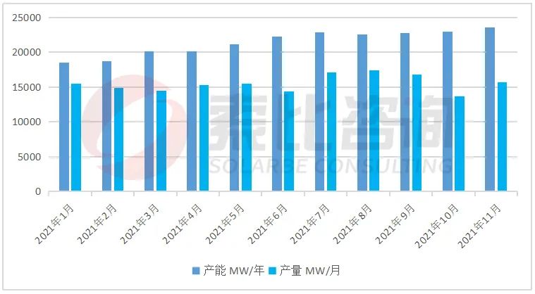 2021年底中國(guó)硅料總產(chǎn)能78萬噸,硅料總產(chǎn)量達(dá)48.78萬噸,預(yù)計(jì)2022年底硅料總產(chǎn)能達(dá)115萬噸,但2022年H1硅料仍持相對(duì)緊缺的狀態(tài),下半年或有緩解。