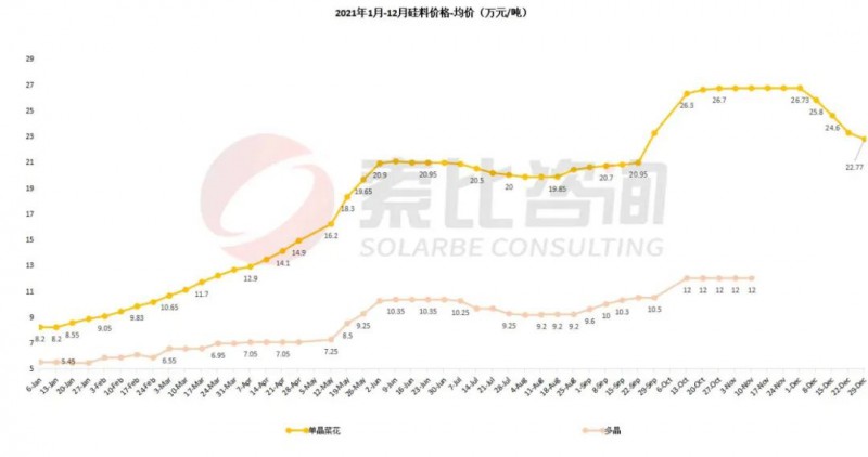 索比咨詢預(yù)計(jì),2022年硅料價(jià)格保持高位運(yùn)行。受新產(chǎn)能投放節(jié)奏影響,預(yù)計(jì)Q2前硅料價(jià)格保持高位,年初價(jià)格在200元/KG,年底將達(dá)100元/KG。