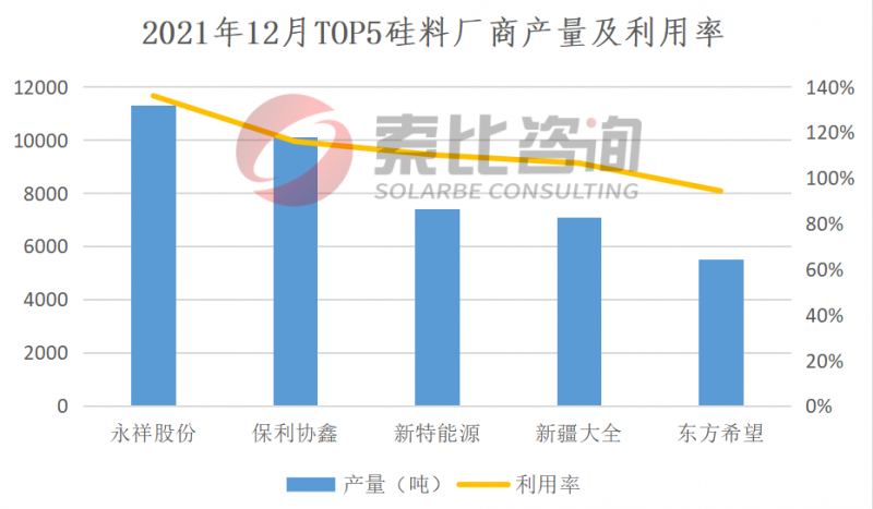 2021年12月,國內(nèi)12家多晶硅企業(yè)在產(chǎn),兩家企業(yè)擴產(chǎn)量逐步釋放,產(chǎn)量再創(chuàng)新高。連續(xù)兩周成交清淡,導(dǎo)致部分硅料企業(yè)有少量庫存積壓。12月份國內(nèi)多晶硅產(chǎn)量為4.88萬噸(約19.28GW),環(huán)比增長15.9%。按照產(chǎn)量排名,永祥、協(xié)鑫、新特、大全、東方希望位列前五,企業(yè)總產(chǎn)量4.14萬噸,占比84.8%,綜合利用率112.6%。索比咨詢預(yù)期1月份硅料產(chǎn)量小幅上漲。從供應(yīng)端來看,12月份協(xié)鑫顆粒硅及新疆大全擴產(chǎn)產(chǎn)能有少量釋放。從需求端來看,終端采購力度有所回暖,開工率上升。