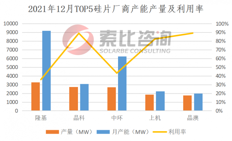 2021年12月,兩家頭部硅片企業(yè)開工率上升至50%和60%,但終端需求不及預(yù)期。2021年12月國內(nèi)硅片產(chǎn)量17.85GW,環(huán)比下降8.6%。按照產(chǎn)量排名,隆基、晶科、中環(huán)、上機、晶澳位列前五,企業(yè)總產(chǎn)量12.35GW,占比69.19%,綜合利用率67.81%。預(yù)計12月份硅片產(chǎn)量將有小幅回升。從供應(yīng)端來看,2022年1月份硅料產(chǎn)量將小幅上漲,硅片也有新產(chǎn)能投產(chǎn)。從需求端來看,終端需求預(yù)期將出現(xiàn)小幅提升。