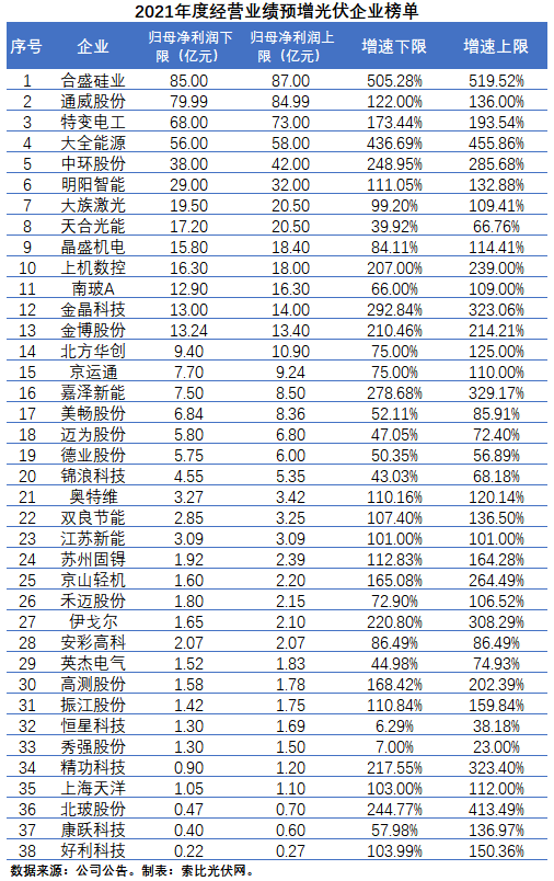 除了這38家企業(yè)以外,其實(shí)還有相當(dāng)多的光伏企業(yè)在2021年經(jīng)營(yíng)業(yè)績(jī)亦呈增長(zhǎng)態(tài)勢(shì),只是它們沒(méi)有達(dá)到業(yè)績(jī)預(yù)告的披露標(biāo)準(zhǔn)而已。