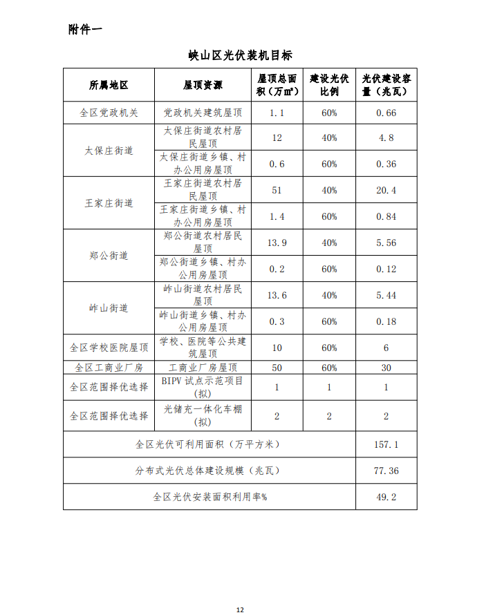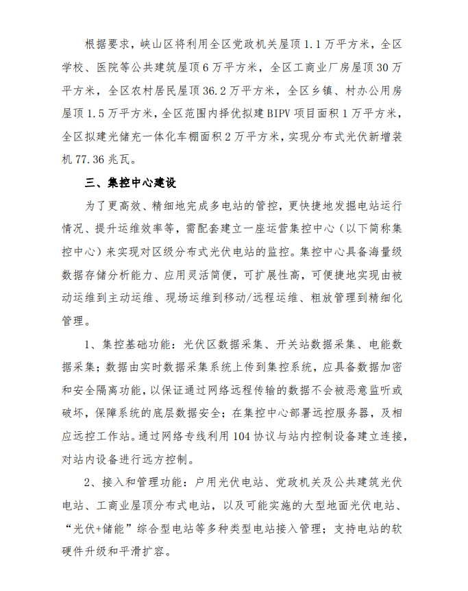 為深入貫徹落實鄉(xiāng)村振興戰(zhàn)略,努力實現(xiàn)國家碳達(dá)峰、碳中和戰(zhàn)略任務(wù),統(tǒng)籌推進“源網(wǎng)荷儲-智慧協(xié)同”的分布式光伏建設(shè),打造全國“雙碳”示范區(qū),根據(jù)峽山區(qū)本地光照條件和屋頂資源情況,結(jié)合國家能源局政策要求,峽山區(qū)將利用全區(qū)黨政機關(guān)屋頂 1.1 萬平方米,全區(qū)學(xué)校、醫(yī)院等公共建筑屋頂 6 萬平方米,全區(qū)工商業(yè)廠房屋頂 30 萬平方米,全區(qū)農(nóng)村居民屋頂36.2 萬平方米,全區(qū)鄉(xiāng)鎮(zhèn)、村辦公用房屋頂 1.5 萬平方米,全區(qū)范圍內(nèi)擇優(yōu)擬建 BIPV 項目面積 1 萬平方米,全區(qū)擬建光儲充一體化車棚面積 2 萬平方米,實現(xiàn)分布式光伏新增裝機 77.36 兆瓦。