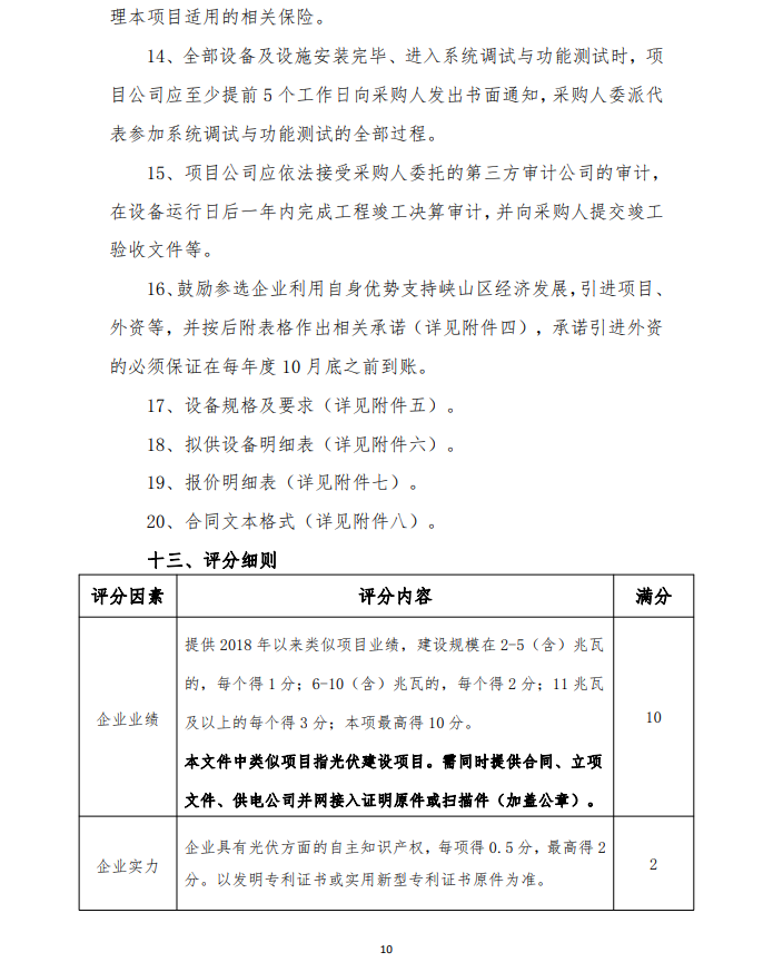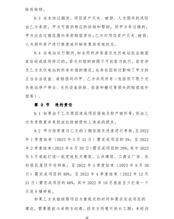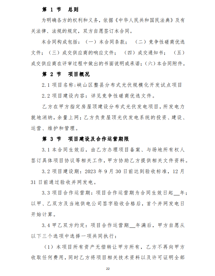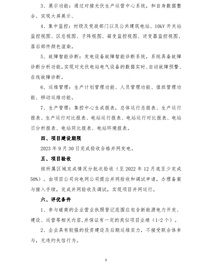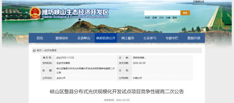2月9日,山東濰坊峽山區(qū)發(fā)布整縣分布式光伏規(guī)?;_發(fā)試點項目競爭性磋商二次公告,要求2023 年 9 月 30 日完成驗收合格并網(wǎng)發(fā)電,按所屬區(qū)域完成情況分批次驗收(至 2022 年 12 月底至少完成50%)。由項目公司向電網(wǎng)公司提出并網(wǎng)驗收和調(diào)試申請,辦理備案與接入手續(xù),完成并網(wǎng)驗收及調(diào)試,實現(xiàn)項目并網(wǎng)運行。至 2023 年底,光伏項目總投資約 4.0946 億元人民幣。
