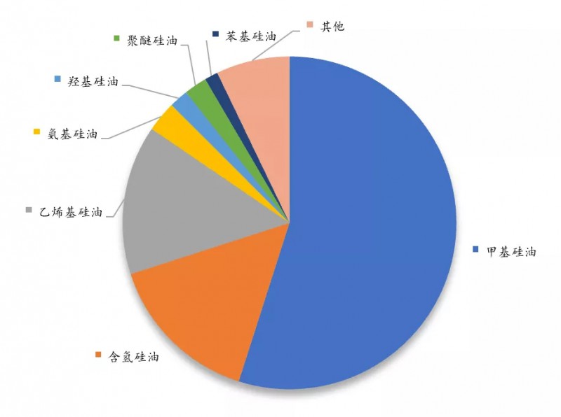 國內(nèi)本土企業(yè)的產(chǎn)品多集中在中低端,如常規(guī)甲基硅油,含氫硅油等,該類產(chǎn)品近幾年呈現(xiàn)與單體廠緊密共生的特征,份額逐步向上游企業(yè)集中。由于過去幾年硅橡膠等下游產(chǎn)品發(fā)展較快,乙烯基硅油等產(chǎn)品的發(fā)展速度也與之相匹配。其他種類硅油如聚醚硅油、氨基硅油、嵌段硅油等特種硅油的產(chǎn)量份額較低,但消費(fèi)增速近幾年有加速態(tài)勢。部分以技術(shù)見長的中小企業(yè)為規(guī)避常規(guī)硅油產(chǎn)品的激烈競爭,轉(zhuǎn)向發(fā)展特種硅油。各種類型的硅油市場份額如圖1所示。