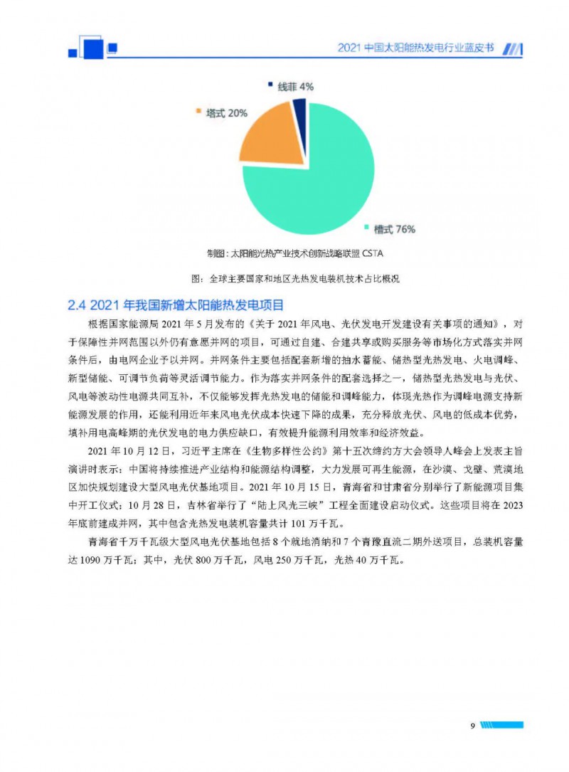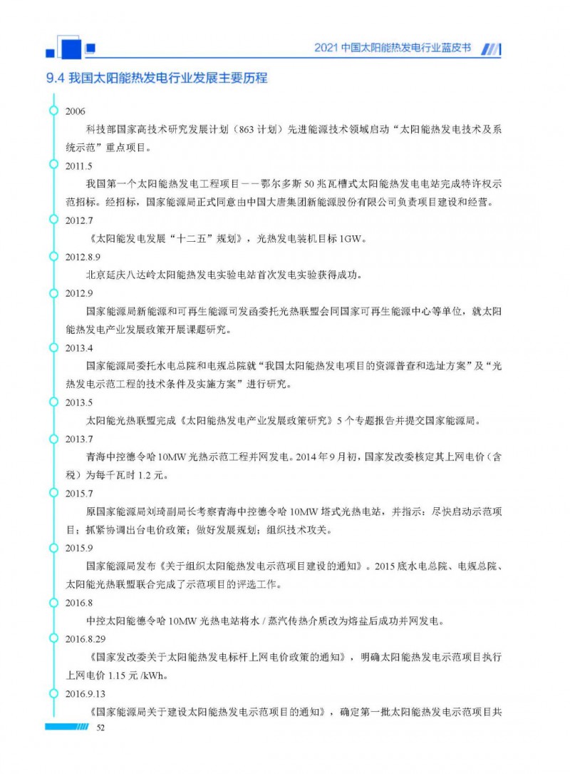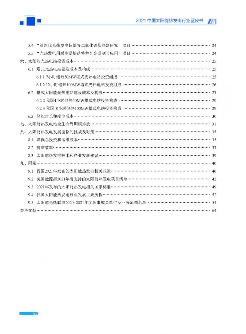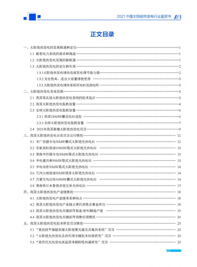 2021中國太陽能熱發(fā)電行業(yè)藍(lán)皮書(以下簡稱“藍(lán)皮書”)共分為9個章節(jié),分別為:太陽能熱發(fā)電的發(fā)展機(jī)遇和定位、太陽能熱發(fā)電市場發(fā)展、我國太陽能熱發(fā)電示范項(xiàng)目運(yùn)行情況、我國太陽能熱發(fā)電產(chǎn)業(yè)鏈情況、我國太陽能熱發(fā)電研發(fā)項(xiàng)目情況、太陽能熱發(fā)電投資成本、太陽能熱發(fā)電站全生命周期碳排放、太陽能熱發(fā)電發(fā)展面臨的挑戰(zhàn)及對策,以及附錄。附錄主要包括:我國2021年發(fā)布的太陽能熱發(fā)電項(xiàng)目政策、美國能源部2021年度支持的太陽能熱發(fā)電項(xiàng)目清單、2021年發(fā)布的太陽能熱發(fā)電相關(guān)國家標(biāo)準(zhǔn)、我國太陽能熱發(fā)電行業(yè)發(fā)展主要?dú)v程、太陽能光熱聯(lián)盟理事成員單位及業(yè)務(wù)范圍名錄。全文4.5萬+字,共55張圖表。
