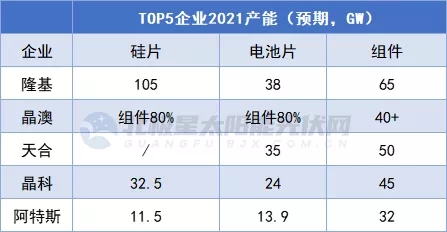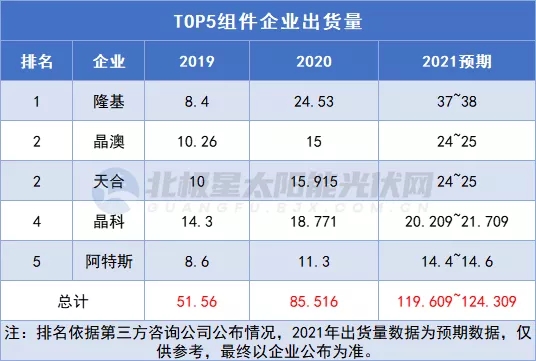 梳理2017年~2021年連續(xù)5年全球組件出貨量排名,TOP5企業(yè)巋然不對,僅排序略有變化。2019年,TOP5企業(yè)即隆基、晶科、天合、晶澳、阿特斯5家企業(yè)組件總出貨量51.56GW,2020年這一數(shù)字增長至85.5GW,而2021年再攀高峰突破120GW。據(jù)BNEF彭博新能源財經(jīng)預(yù)測,2021年全球光伏新增裝機(jī)或達(dá)183GW。這也意味著TOP5組件企業(yè)的市場占比達(dá)到六成以上。