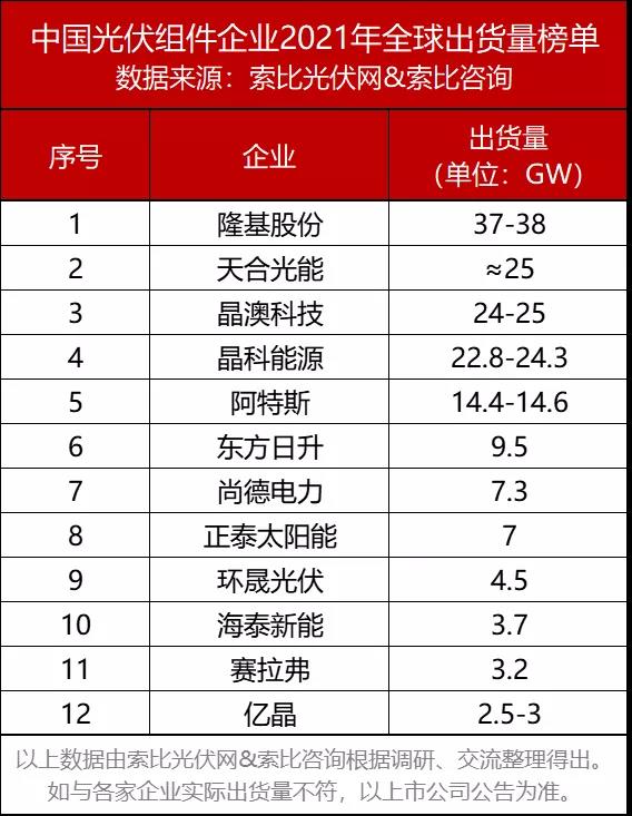 從索比光伏網(wǎng)&索比咨詢發(fā)布的《中國光伏組件企業(yè)2021年全球出貨量榜單》看,隆基股份、天合光能、晶澳科技、晶科能源、阿特斯、東方日升、尚德電力、正泰太陽能、環(huán)晟光伏、海泰新能、賽拉弗、億晶光電等企業(yè)名列前茅,出貨量合計(jì)約140GW,占全球組件總需求的75%以上。無論在國內(nèi)還是海外市場,他們都斬獲頗豐。