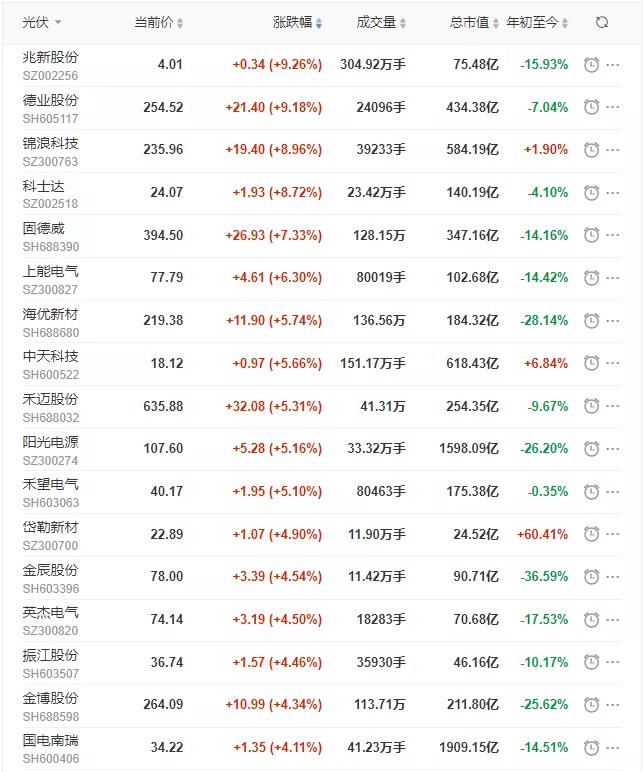 個股方面,兆新股份、德業(yè)股份漲超9%,錦浪科技漲幅達到8.96%,固德威漲超7%,上能電氣漲超6%,禾邁股份、陽光電源等漲超5%,天合光能、賽伍技術(shù)、中來股份、通威股份、晶澳科技等漲超3%,正泰電器、中信博、特變電工、高測股份、隆基股份等漲超2%,邁為股份、愛旭股份、通靈股份、東方日升等漲超1%。