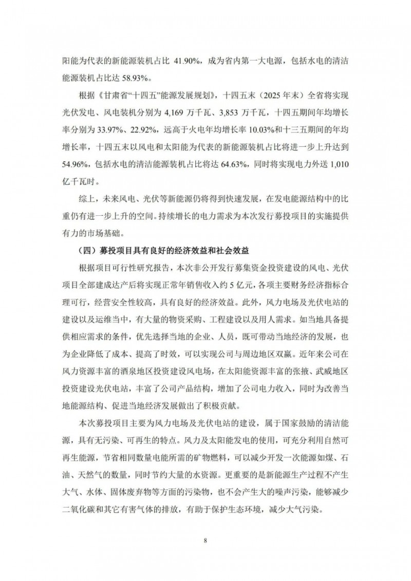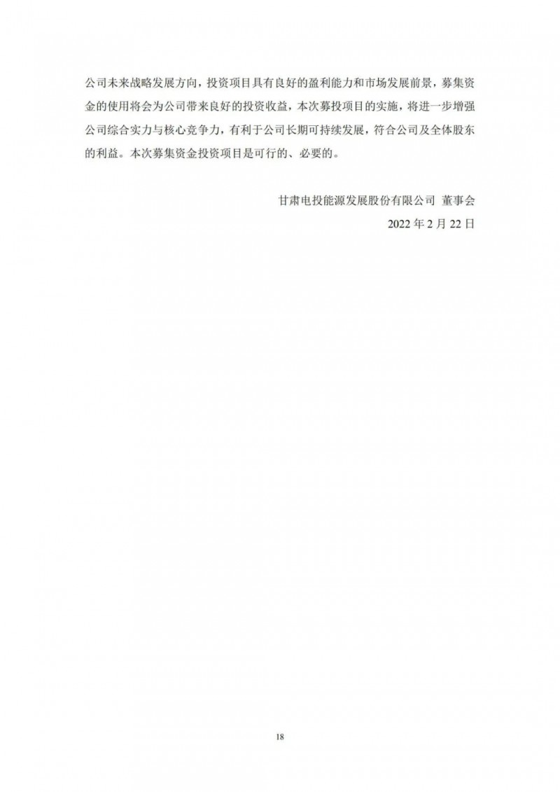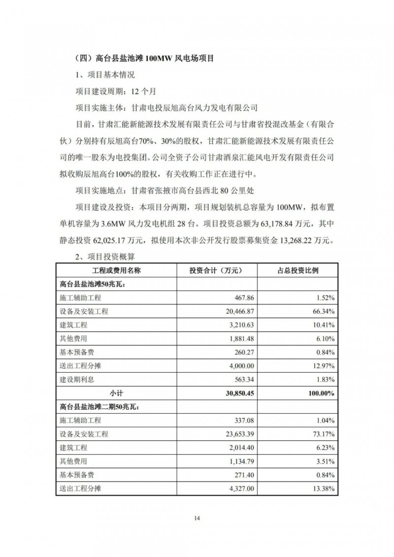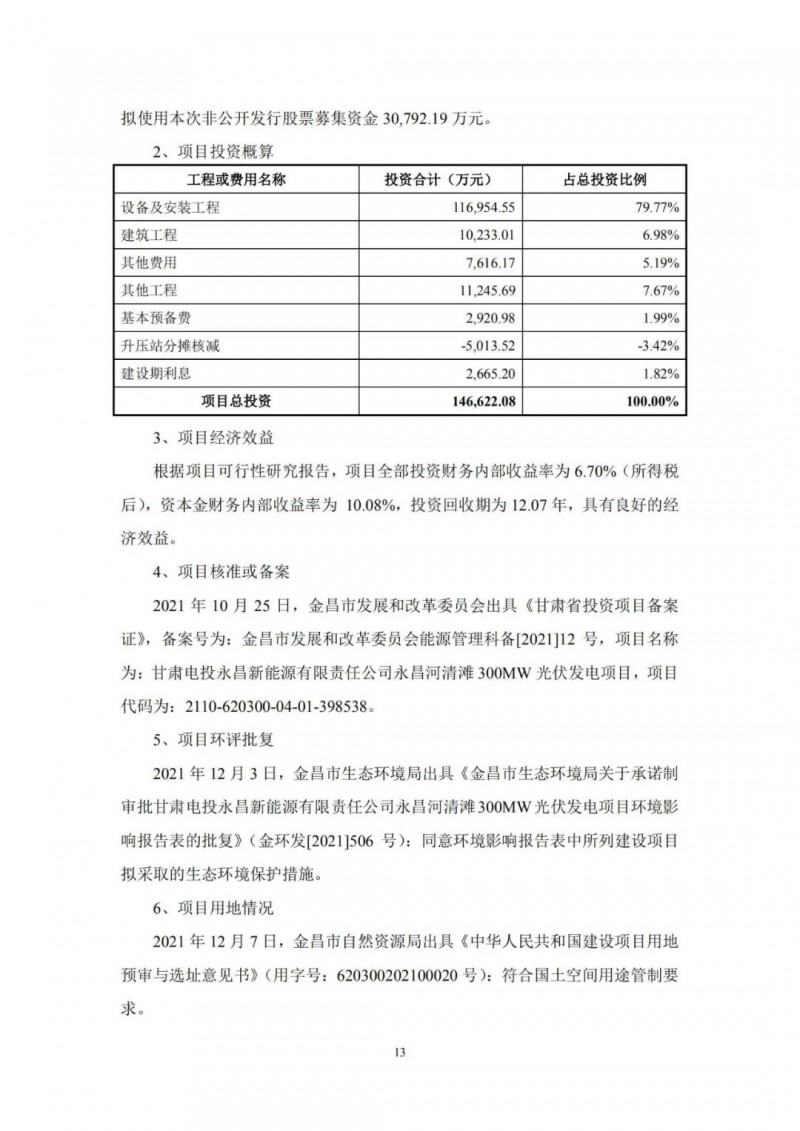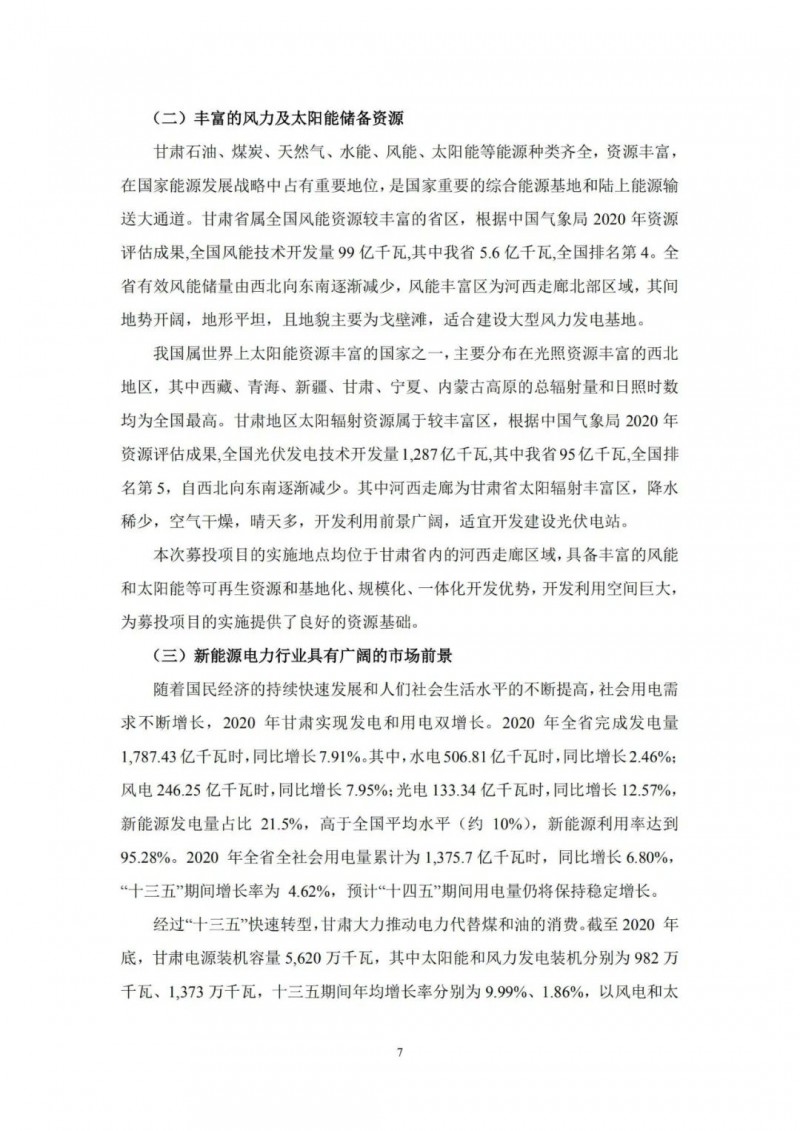2月21日,甘肅電投發(fā)布公告,擬定增募資不超過12億元,用于玉門市麻黃灘第一風電場C區(qū)200兆瓦項目、瓜州干河口200MW光伏項目、永昌河清灘300MW光伏發(fā)電項目、高臺縣鹽池灘100MW風電場項目及補充流動資金。天眼查app顯示,公司是于1997年7月8日經(jīng)甘肅省人民政府甘政函[1997]36號文件批準,由西北油漆廠獨家發(fā)起,部分改制,采用募集設(shè)立方式設(shè)立的股份有限公司。公司1997年8月29日向社會公眾公開發(fā)行4500萬股人民幣普通股,并于1997年9月23在甘肅省工商行政管理局登記注冊。1997年10月14日經(jīng)中國證券監(jiān)督管理委員會批準,公司股票在深圳證券交易所上市交易。自2012年12月21日起,公司名稱由"西北永新化工股份有限公司"變更為"甘肅電投能源發(fā)展股份有限公司"。