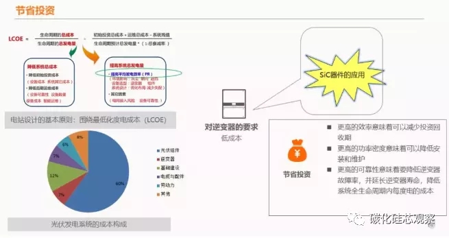 實際上,在光伏發(fā)電的系統(tǒng)當中,硅基的逆變器的成本占到系統(tǒng)的10%左右,但它卻是系統(tǒng)損耗的一個主要來源。如果通過使用碳化硅功率模塊的光伏逆變器,系統(tǒng)的轉(zhuǎn)化效率可以從96%提升到99%以上,能量損耗能夠降低50%以上,能夠顯著的提高循環(huán)設(shè)備的使用壽命,能夠降低系統(tǒng)的體積,增加功率密度,從而降低生產(chǎn)成本。