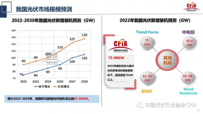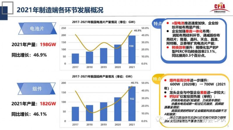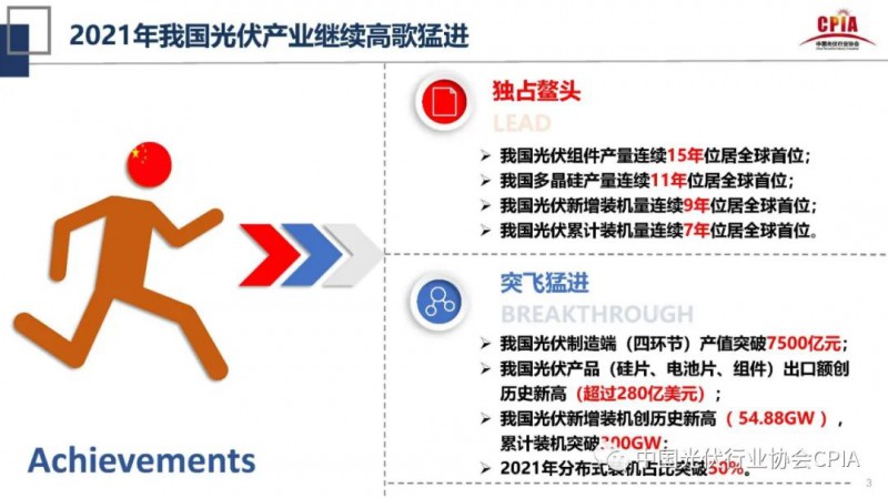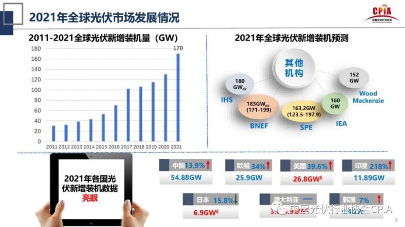 2022年2月23日,2021年發(fā)展回顧與2022年形勢展望線上研討會(huì)采用直播形式順利召開,中國光伏行業(yè)協(xié)會(huì)名譽(yù)理事長王勃華出席會(huì)議并作2021年光伏行業(yè)發(fā)展回顧與2022年形勢展望,王勃華指出,2021年我國光伏行業(yè)繼續(xù)高歌猛進(jìn),制造端,應(yīng)用端,進(jìn)出口都取得了快速增長,2022年我國光伏市場在巨大的規(guī)模儲(chǔ)備下或?qū)⒃鲋?5GW以上。