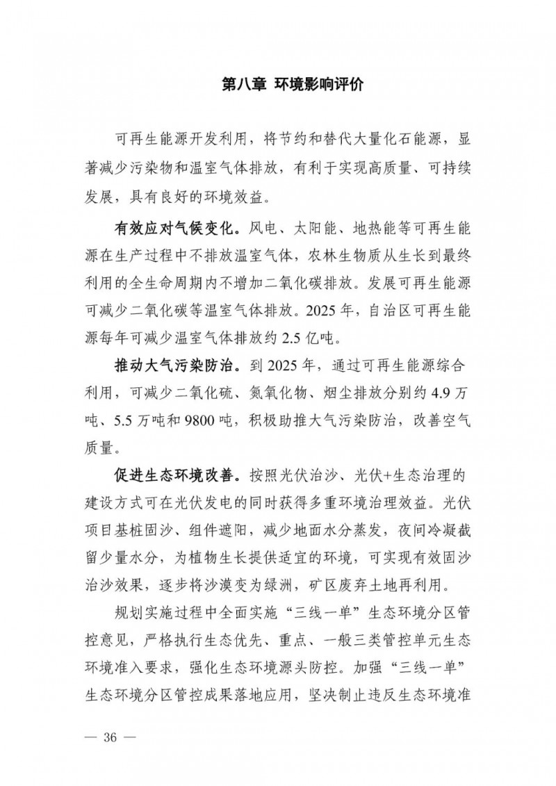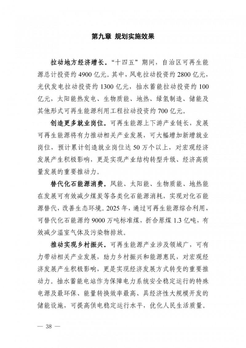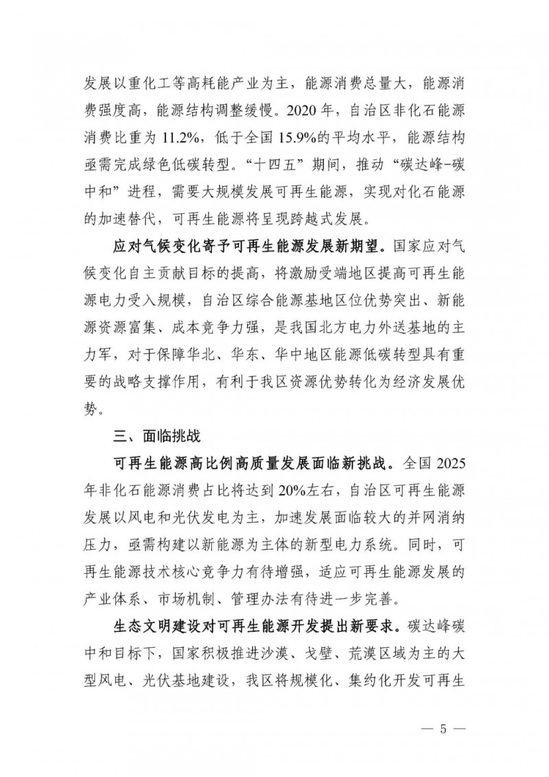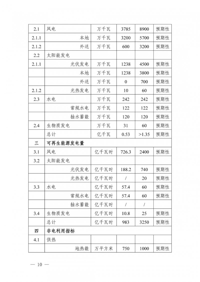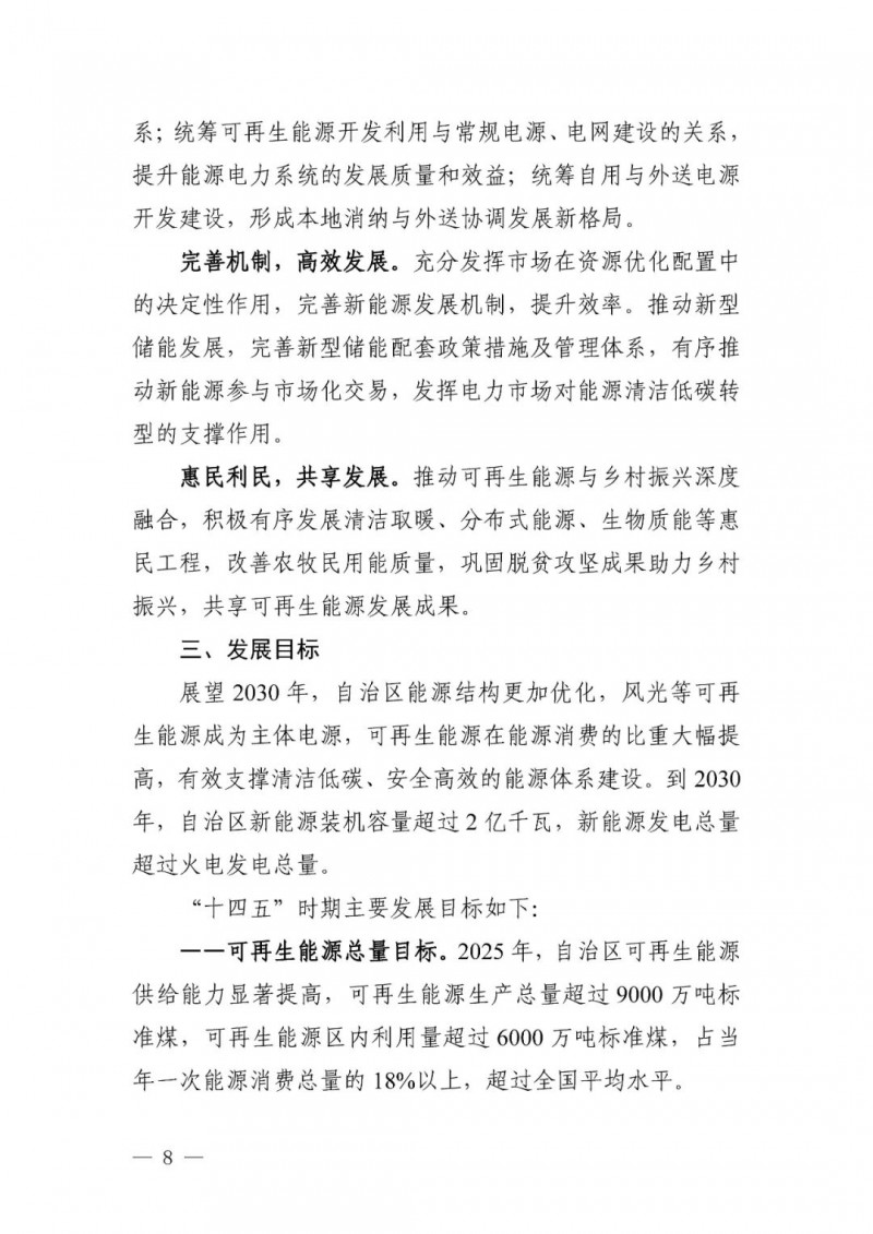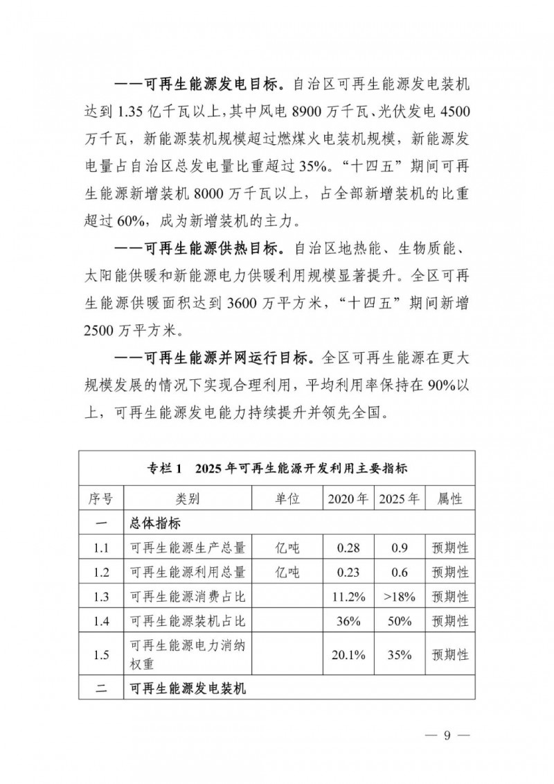 可再生能源總量目標。至2025 年,自治區(qū)可再生能源生產(chǎn)總量超過 9000萬噸標準煤,可再生能源區(qū)內(nèi)利用量超過6000萬噸標準煤,占當(dāng)年一次能源消費總量的18%以上,超過全國平均水平。