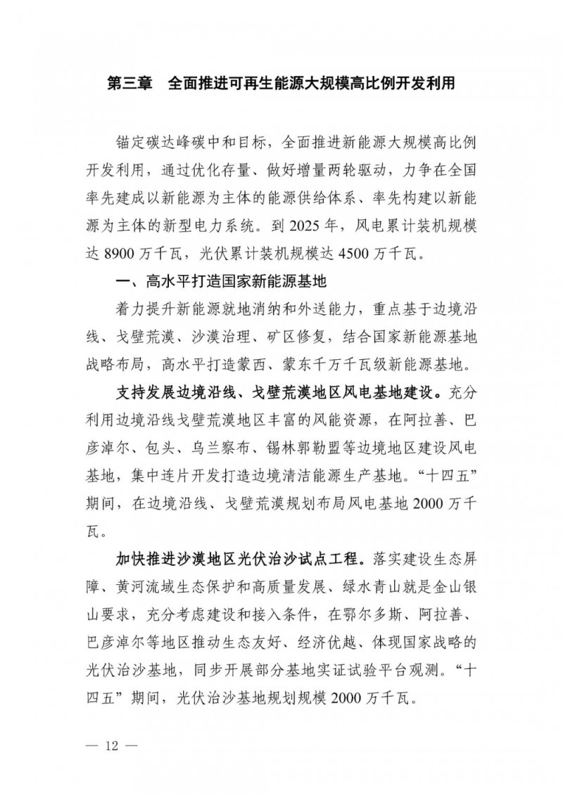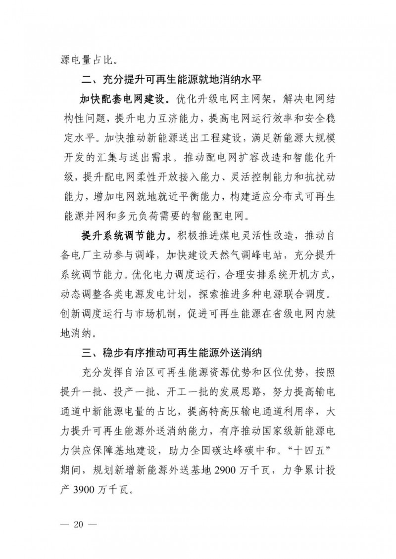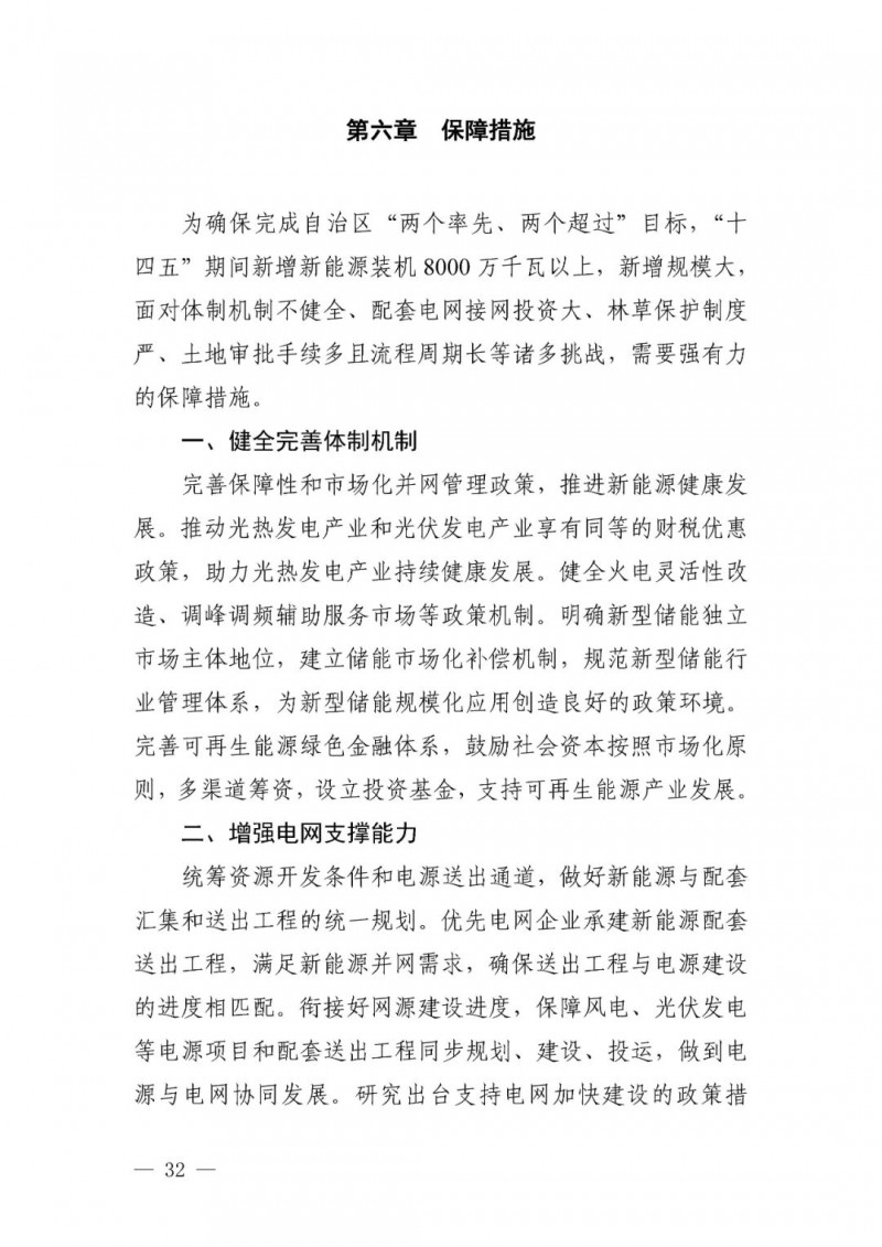 可再生能源發(fā)電目標。自治區(qū)可再生能源發(fā)電裝機達到 1.35 億千瓦以上,其中風(fēng)電 8900 萬千瓦、光伏發(fā)電 4500 萬千瓦,新能源裝機規(guī)模超過燃煤火電裝機規(guī)模,新能源發(fā)電量占自治區(qū)總發(fā)電量比重超過35%。“十四五”期間可再生能源新增裝機 8000 萬千瓦以上,占全部新增裝機的比重超過 60%,成為新增裝機的主力。