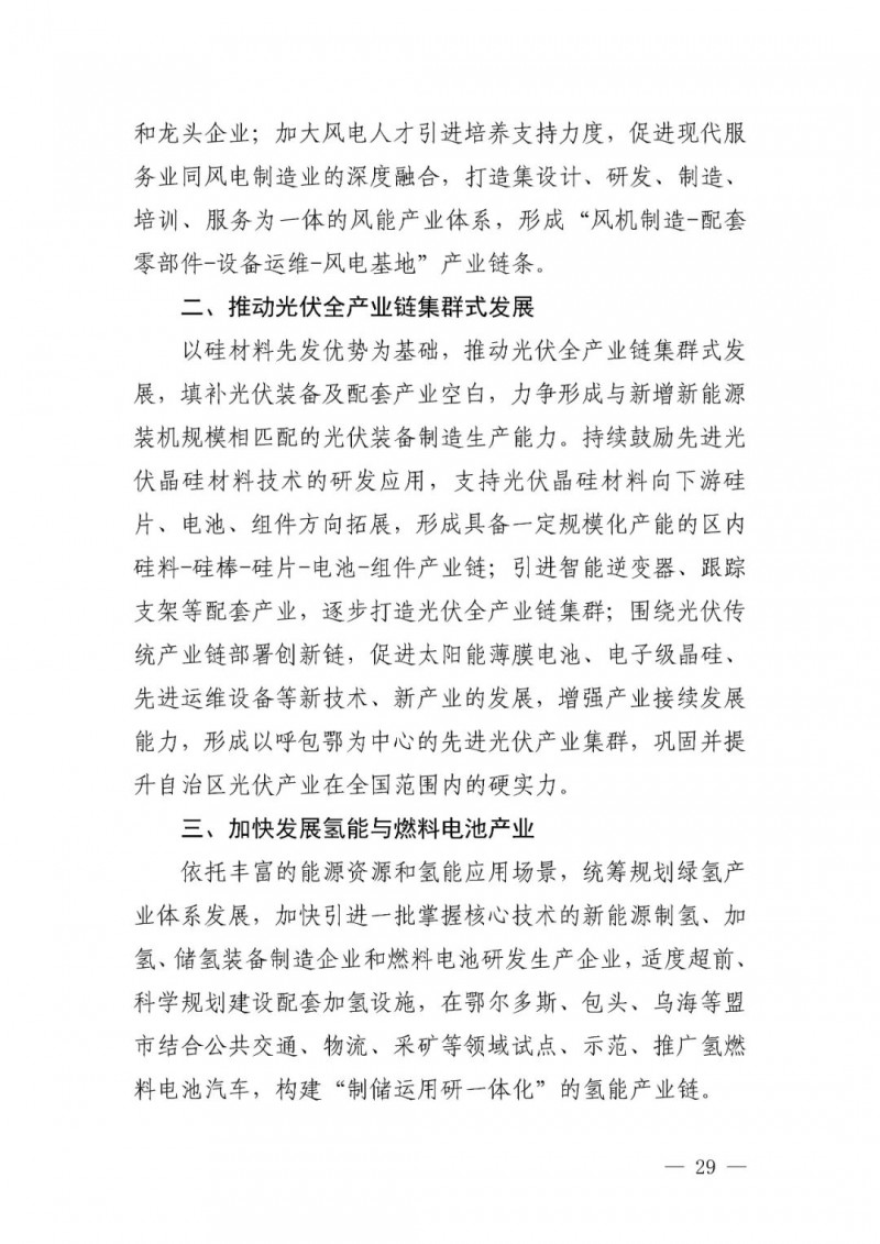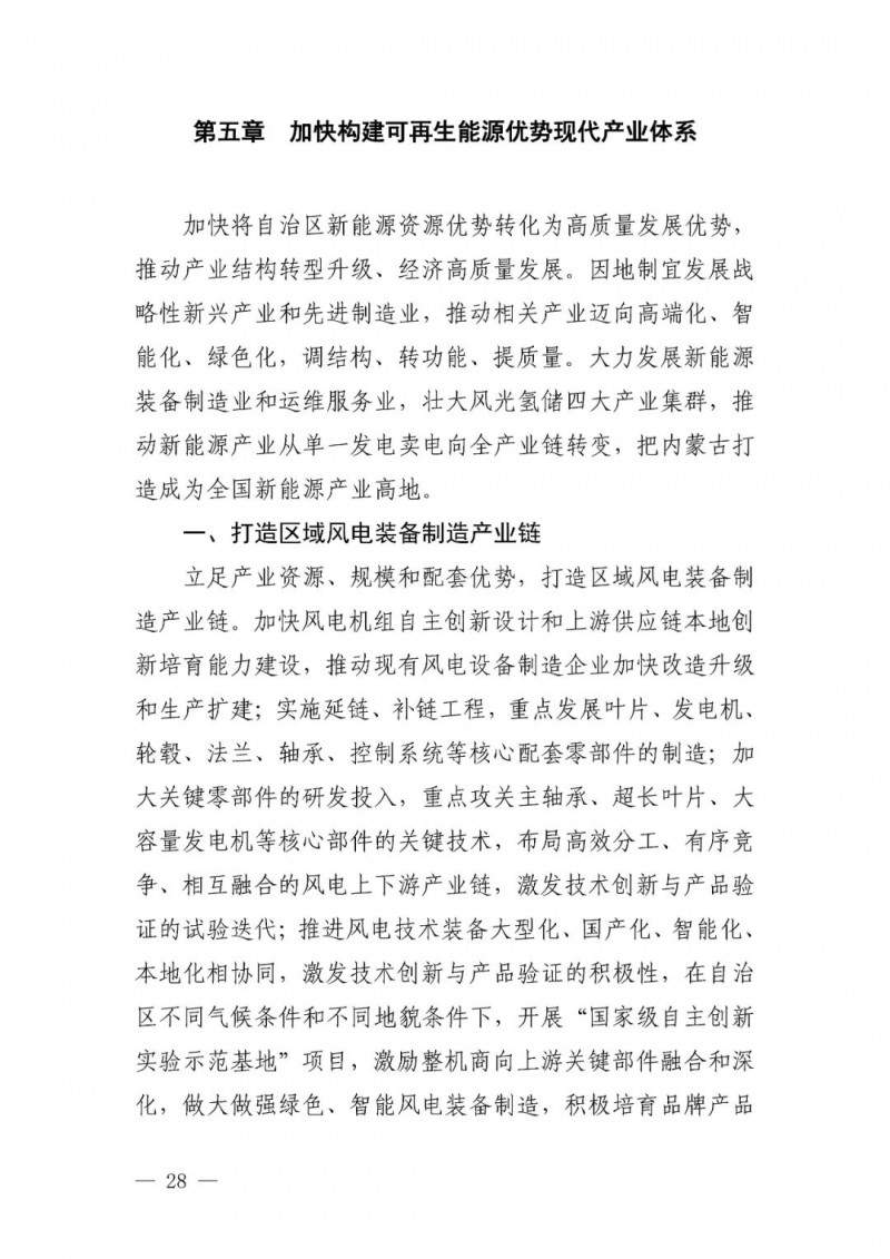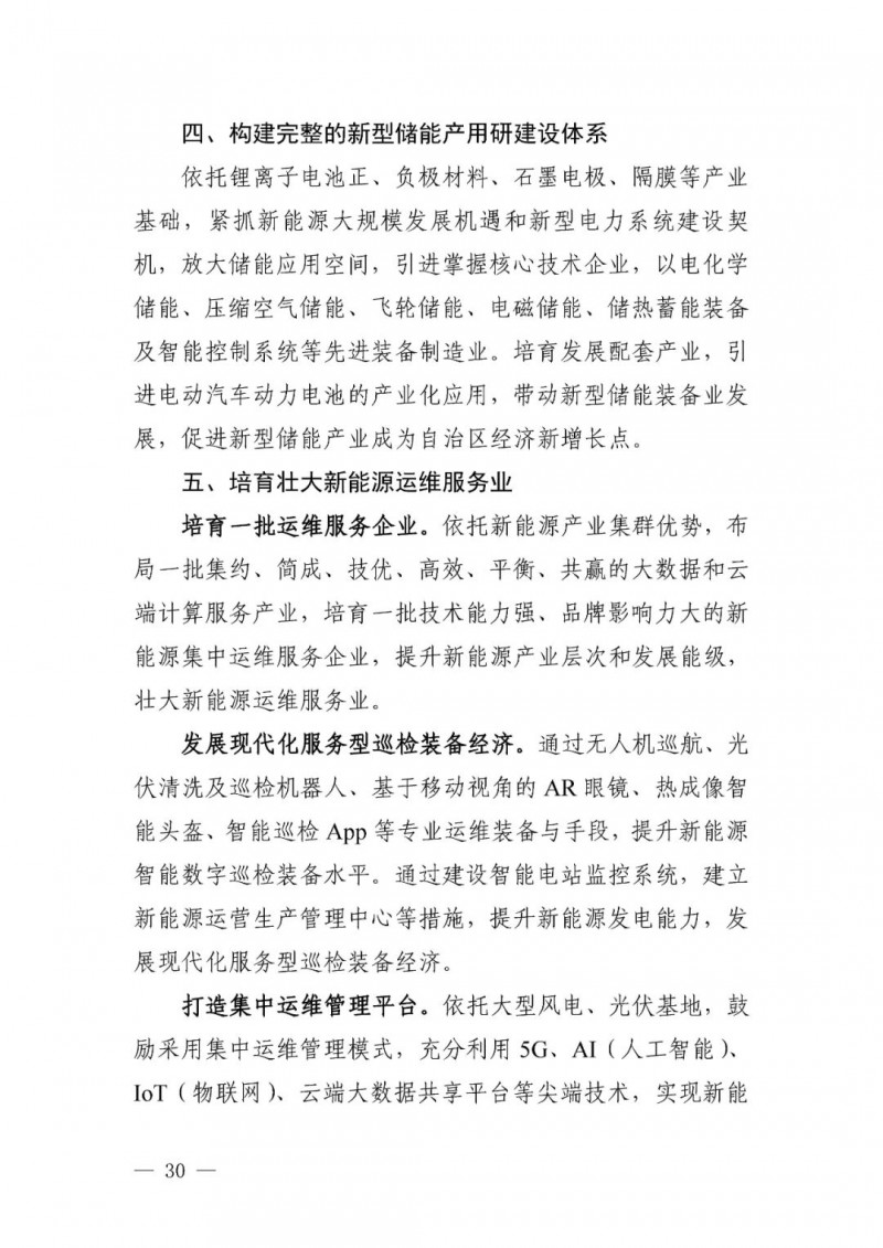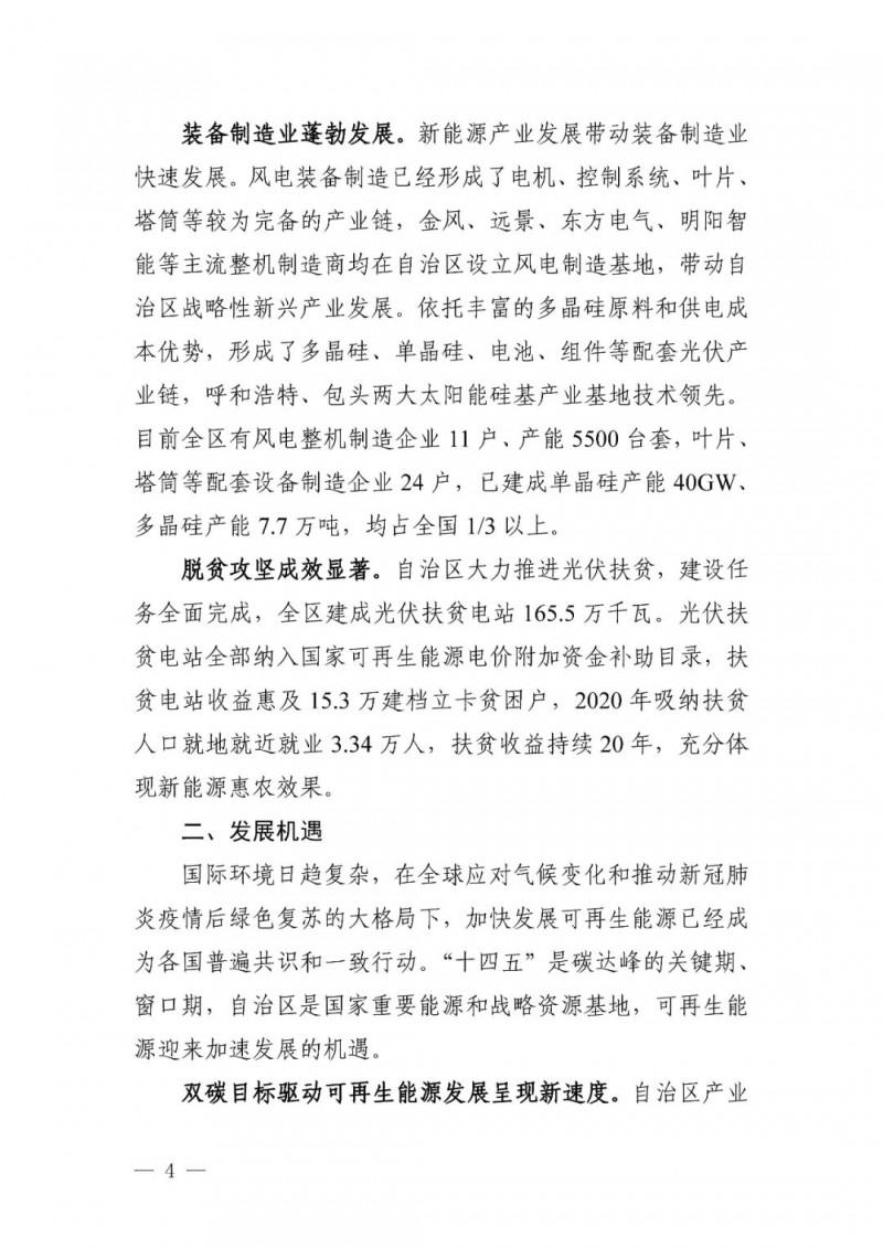 可再生能源發(fā)電目標。自治區(qū)可再生能源發(fā)電裝機達到 1.35 億千瓦以上,其中風(fēng)電 8900 萬千瓦、光伏發(fā)電 4500 萬千瓦,新能源裝機規(guī)模超過燃煤火電裝機規(guī)模,新能源發(fā)電量占自治區(qū)總發(fā)電量比重超過35%。“十四五”期間可再生能源新增裝機 8000 萬千瓦以上,占全部新增裝機的比重超過 60%,成為新增裝機的主力。