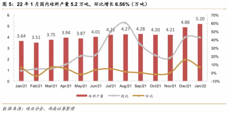 在終端需求的支撐下,產(chǎn)業(yè)鏈各環(huán)節(jié)開(kāi)工率提升,1月產(chǎn)量創(chuàng)2021年以來(lái)歷史新高,帶動(dòng)原材料需求增長(zhǎng)。根據(jù)業(yè)內(nèi)數(shù)據(jù),2022年1月國(guó)內(nèi)硅片產(chǎn)量20.6GW,環(huán)比增加15.4%,產(chǎn)量Top5企業(yè)綜合開(kāi)工率提升至70.45%,環(huán)比增長(zhǎng)約2.6pp;電池片產(chǎn)量20.86GW,環(huán)比增長(zhǎng)16.99%,主流電池企業(yè)綜合開(kāi)工率達(dá)76.59%;組件產(chǎn)量19.73GW,環(huán)比增長(zhǎng)23.31%,Top5組件企業(yè)綜合開(kāi)工率68.11%,環(huán)比提升約10pp,也反向印證終端需求向好局面。各環(huán)節(jié)開(kāi)工率提升直接帶動(dòng)上游硅料-硅片原材料需求增長(zhǎng)。