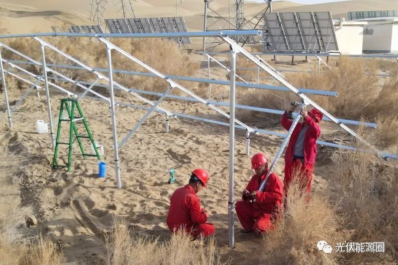 從1月18日人員入場(chǎng)平整場(chǎng)地開(kāi)始,施工人員每天都自帶午餐加快施工進(jìn)度。3月初太陽(yáng)能設(shè)備到場(chǎng)后,施工人員按照施工工序全面鋪開(kāi)。截至目前,86個(gè)螺旋樁基礎(chǔ)已全部完成,安裝支架30個(gè),安裝太陽(yáng)能板4個(gè)。