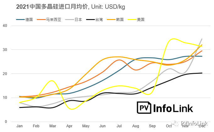 價(jià)格方面,各地區(qū)進(jìn)口的硅料價(jià)格在2021年隨市場均價(jià)普遍呈現(xiàn)逐月上漲的趨勢,與整年多晶硅市場的價(jià)格變化趨勢相符。個(gè)別國家的價(jià)格表現(xiàn)上,具有較穩(wěn)定產(chǎn)能與產(chǎn)品品質(zhì)的德國和馬來西亞的價(jià)格表現(xiàn)較佳,而其他進(jìn)口量較小或是透過轉(zhuǎn)口貿(mào)易方式的進(jìn)口市場則在價(jià)格穩(wěn)定性的表現(xiàn)上不如德國和馬來西亞。