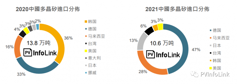 2021年進(jìn)口多晶硅主要來自德國和馬來西亞,兩者占比達(dá)到了75%,主因兩國擁有瓦克和OCI兩家目前生產(chǎn)較為穩(wěn)定的非中國廠家。與2020年比較,出口多晶硅到中國的國家數(shù)量減少,且過去占據(jù)進(jìn)口量第一名的韓國占比快速縮小,在韓國國內(nèi)生產(chǎn)設(shè)施目前沒有重啟的意愿下,預(yù)期未來占比將趨近于0%。其他來自日本或是臺(tái)灣的多晶硅進(jìn)口,因該地區(qū)沒有多晶硅生產(chǎn)設(shè)施,可能是過去所簽訂的多晶硅長單未完全使用而轉(zhuǎn)售,但也僅有小量的占比。