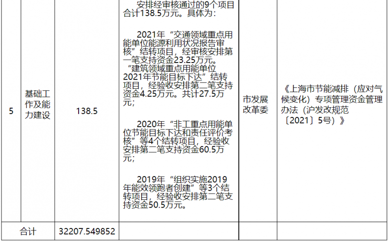 (五)按照《上海市節(jié)能減排(應(yīng)對氣候變化)專項管理資金管理辦法》(滬發(fā)改規(guī)范〔2021〕5號)等規(guī)定,安排經(jīng)審核通過的9個項目合計138.5萬元。具體為: