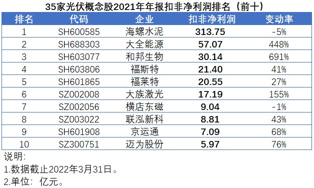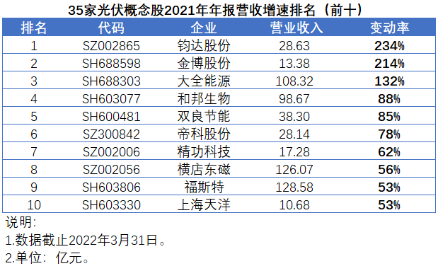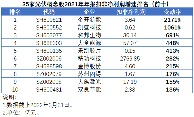在光伏行業(yè)火熱的市場氛圍中,2022年已經(jīng)悄然走過了四分之一。在過去的三個月中,A股市場共有35家光伏概念股發(fā)布了2021年年報,營收增速均值和中值分別為44%和37%,扣非凈利潤增速均值高達147%,不過中值僅為27%。