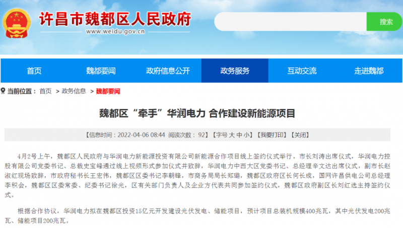 4月2號,河南許昌魏都區(qū)人民政府與華潤電力新能源投資有限公司新能源合作項(xiàng)目線上簽約儀式舉行。