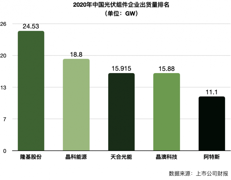 2020年,隆基股份組件出貨量爆增至24.53吉瓦,魚躍登上了全球光伏組件出貨排名的“鐵王座”,成為中國組建廠商的“執(zhí)牛耳者”。