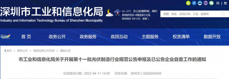 深圳市工業(yè)和信息化局發(fā)布關(guān)于開展第十一批光伏制造行業(yè)規(guī)范公告申報及已公告企業(yè)自查工作的通知。