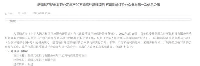 項目名稱:新疆其亞鋁電有限公司年產(chǎn)20萬噸高純晶硅項目