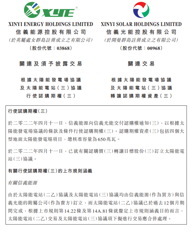 4月11日,信義能源及信義光能聯(lián)合公布公告稱,于2022年4月11日信義能源向信義光能交付認(rèn)購權(quán)通知(三),以根據(jù)太陽能發(fā)電場協(xié)議的條款及條件行使認(rèn)購期權(quán)(三)。認(rèn)購期權(quán)資產(chǎn)(三)包括四個大型地面太陽能發(fā)電場項目,總核準(zhǔn)容量為650兆瓦。