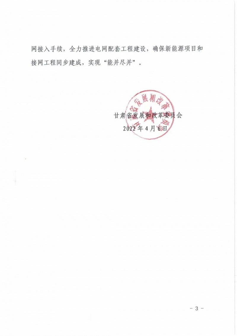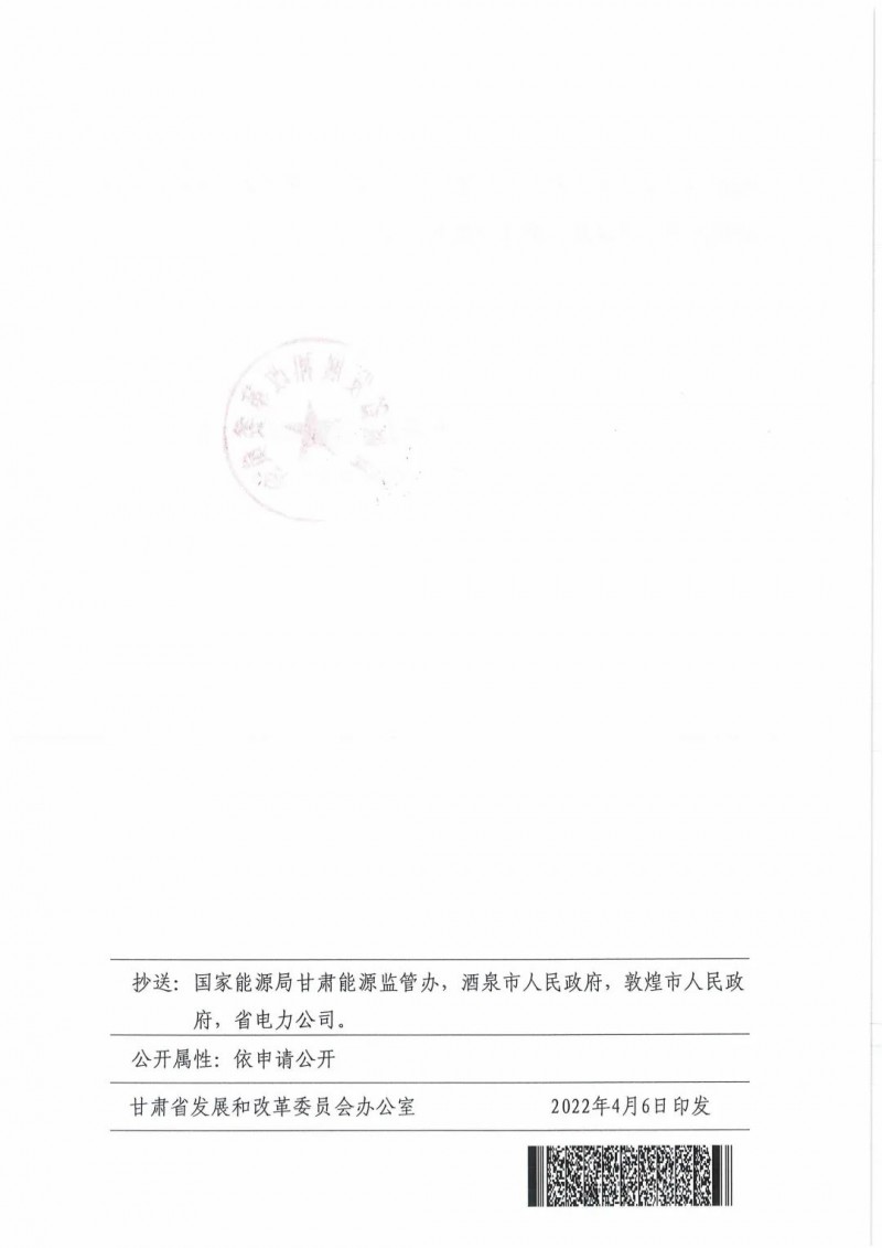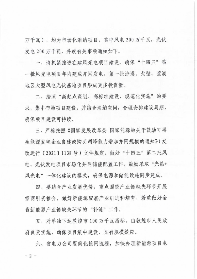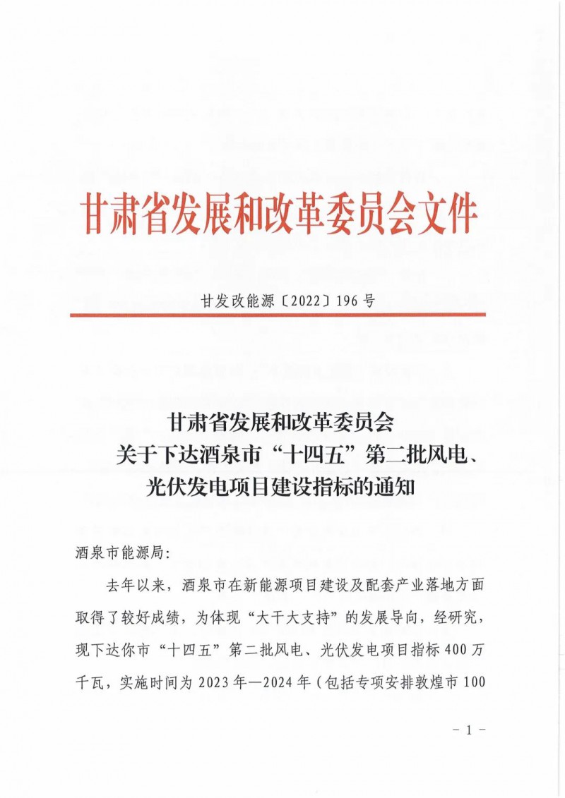 4月6日,甘肅省發(fā)展和改革委員會(huì)下發(fā)《關(guān)于下達(dá)酒泉市“十四五”第二批風(fēng)電、光伏發(fā)電項(xiàng)目建設(shè)指標(biāo)的通知》(甘發(fā)改能源〔2022)196號(hào))。《通知》提出酒泉市"十四五"第二批風(fēng)電、光伏發(fā)電項(xiàng)目指標(biāo)為400萬(wàn)千瓦,實(shí)施時(shí)間為2023-2024年(包括專項(xiàng)安排敦煌市100萬(wàn)千瓦),均為市場(chǎng)化消納項(xiàng)目,其中風(fēng)電200萬(wàn)千瓦,光伏發(fā)電200萬(wàn)千萬(wàn)。