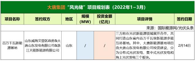 截至2022年3月31日,大唐集團(tuán)共簽約(規(guī)劃)1個(gè)風(fēng)光儲(chǔ)項(xiàng)目,該項(xiàng)目只簽署了合作協(xié)議。