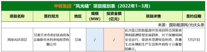 截至2022年3月31日,中核集團(tuán)共簽約(規(guī)劃)1個(gè)風(fēng)光儲(chǔ)項(xiàng)目,該項(xiàng)目只簽署了合作協(xié)議。