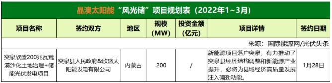 此外,晶澳太陽(yáng)能簽約風(fēng)光儲(chǔ)項(xiàng)目1個(gè),項(xiàng)目規(guī)劃規(guī)模200MW。