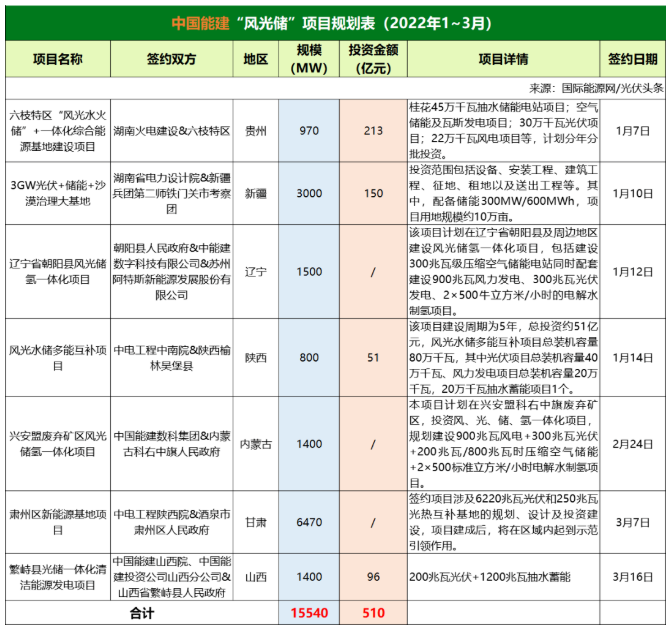 截至2022年3月31日,國(guó)家能源集團(tuán)共簽約(規(guī)劃)5個(gè)風(fēng)光儲(chǔ)項(xiàng)目,明確項(xiàng)目規(guī)模共計(jì)7.56GW。