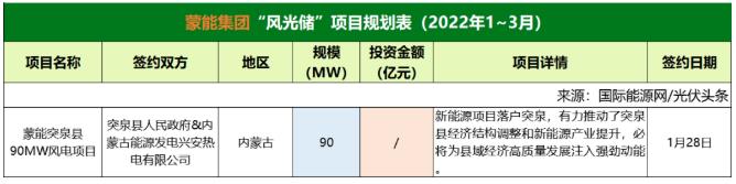 截至2022年3月31日,蒙能集團(tuán)共簽約(規(guī)劃)1個(gè)風(fēng)光儲(chǔ)項(xiàng)目,項(xiàng)目規(guī)模為90MW。