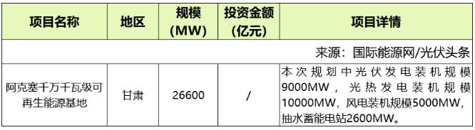 在已經(jīng)公布規(guī)模的項(xiàng)目中,最大的項(xiàng)目為甘肅靖遠(yuǎn)縣150萬(wàn)千瓦風(fēng)電、光伏新能源發(fā)電項(xiàng)目,最小的項(xiàng)目為新疆生產(chǎn)建設(shè)兵團(tuán)第三師45團(tuán)40萬(wàn)千瓦光伏發(fā)電項(xiàng)目。