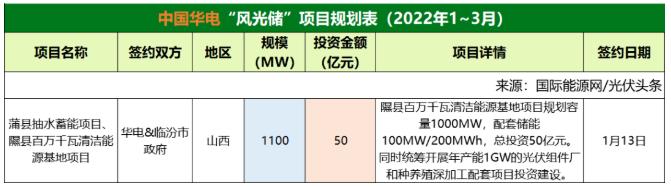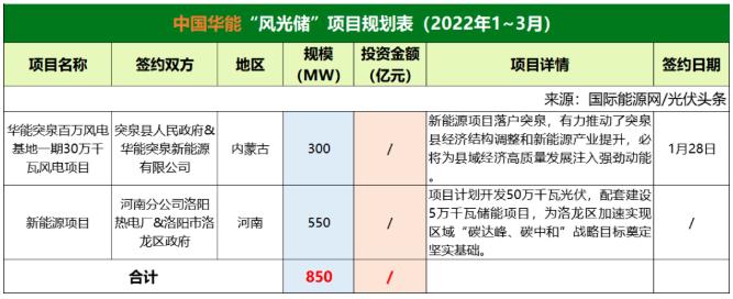 截至2022年3月31日,華能共簽約(規(guī)劃)2個(gè)風(fēng)光儲(chǔ)項(xiàng)目,明確規(guī)模共計(jì)850MW。
