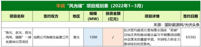 截至2022年3月31日,華潤(rùn)共簽約(規(guī)劃)1個(gè)風(fēng)光儲(chǔ)項(xiàng)目,項(xiàng)目規(guī)模1.2GW。
