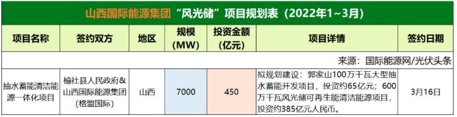 截至2022年3月31日,山西國(guó)際能源集團(tuán)共簽約(規(guī)劃)1個(gè)風(fēng)光儲(chǔ)項(xiàng)目,項(xiàng)目規(guī)模為7000MW,投資金額450億元。
