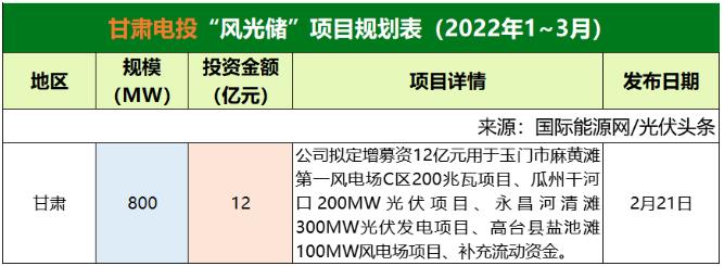 截至2022年3月31日,甘肅電投共規(guī)劃1個(gè)風(fēng)光儲(chǔ)項(xiàng)目,項(xiàng)目規(guī)模為800MW,投資金額12億元。