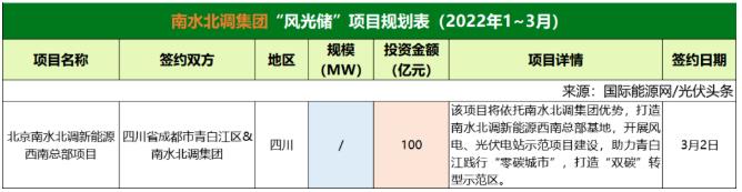 截至2022年3月31日,南水北調(diào)集團(tuán)共簽約(規(guī)劃)1個(gè)風(fēng)光儲(chǔ)項(xiàng)目,投資金額為100億元。