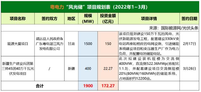 截至2022年3月31日,粵電力共簽約(規(guī)劃)2個(gè)風(fēng)光儲(chǔ)項(xiàng)目,明確規(guī)模共計(jì)1.9GW,明確投資金額共計(jì)172.27億元。